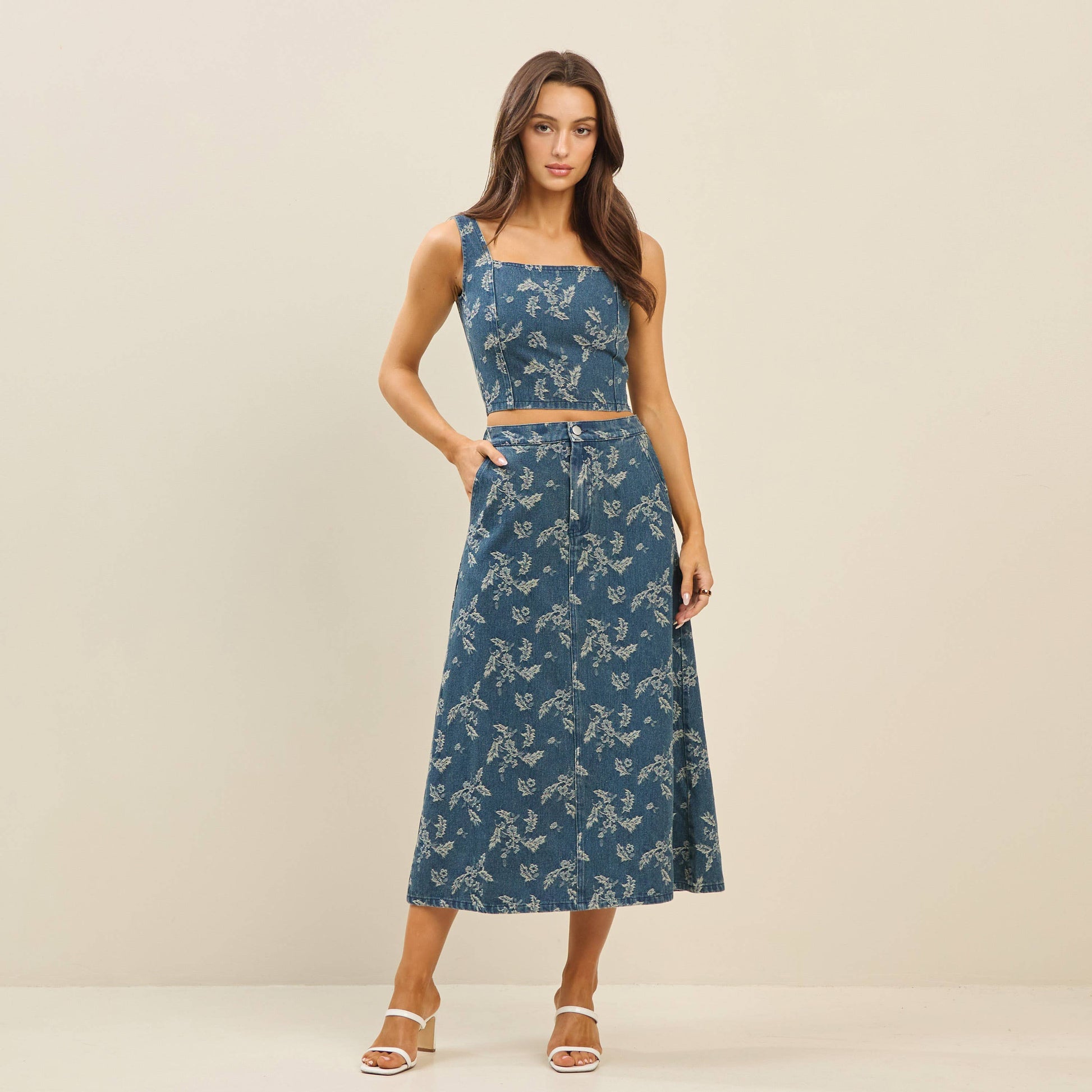 Rock a fresh two-piece look with this playful denim set featuring charming floral embellishments. The sleeveless top pairs perfectly with a matching skirt, giving you an effortless outfit that's ready for anything. Textured florals add a whimsical touch to classic denim, making this set your go-to for casual style with personality.
