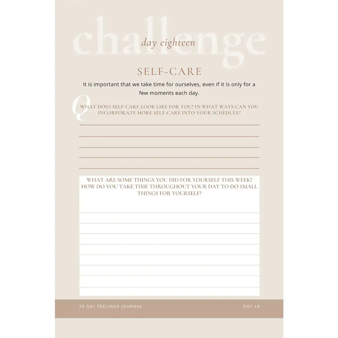 The 30 day feelings journal gives daily prompts over a 30 day period to help you dig deeper into yourself and your experiences. Each writing prompt is designed to help you reflect on past, present or future topics that may have helped shaped who you've become today.
