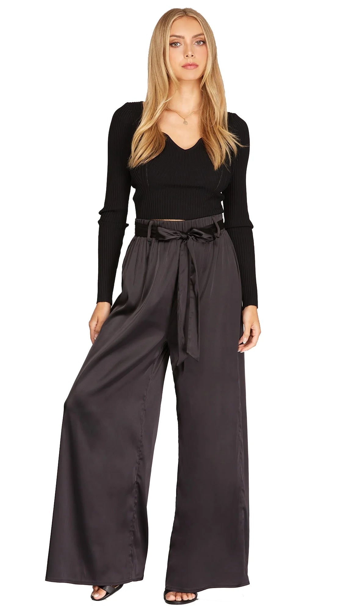 Side to Side Satin Sash Waist Wide Leg Pants